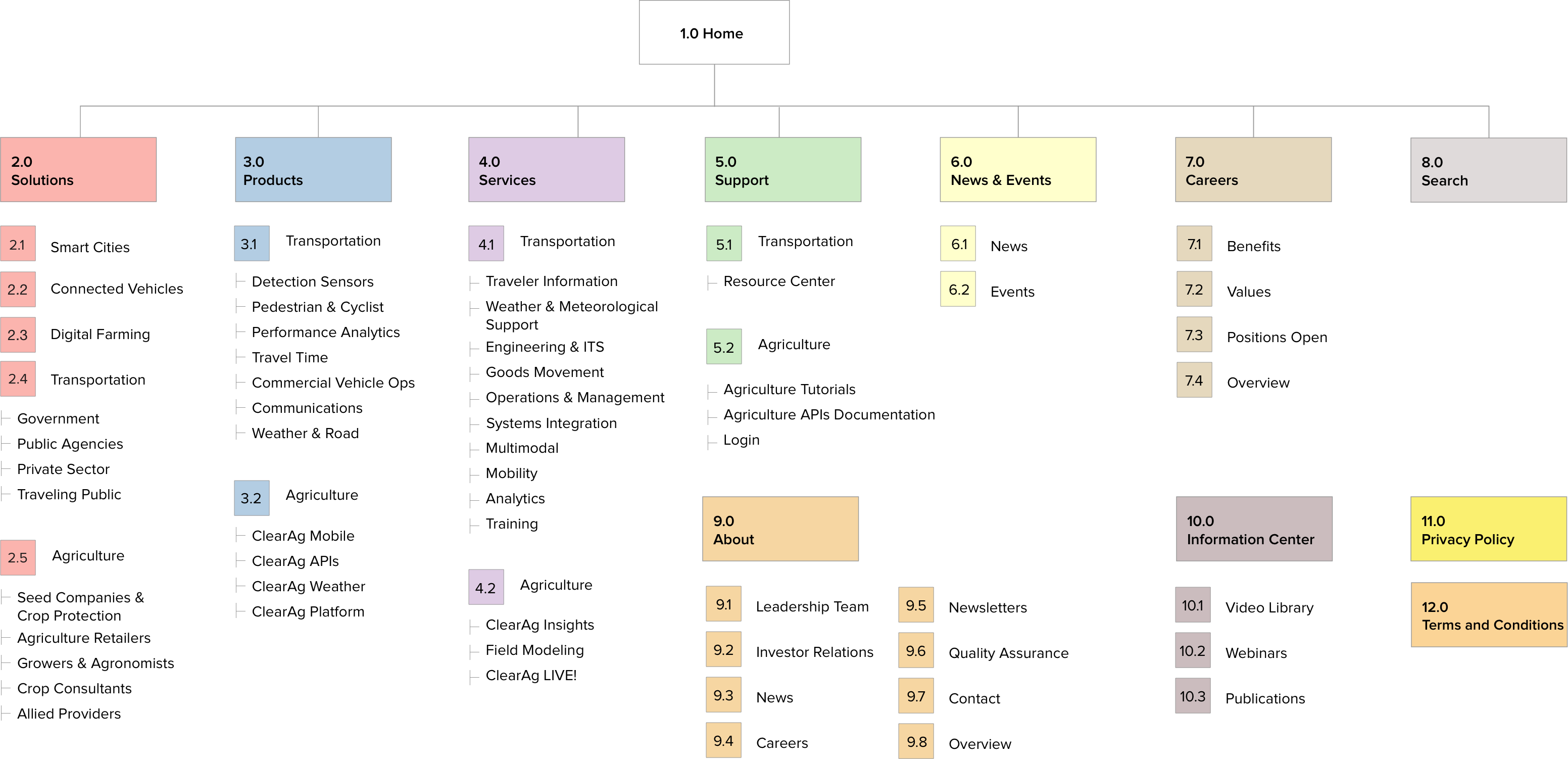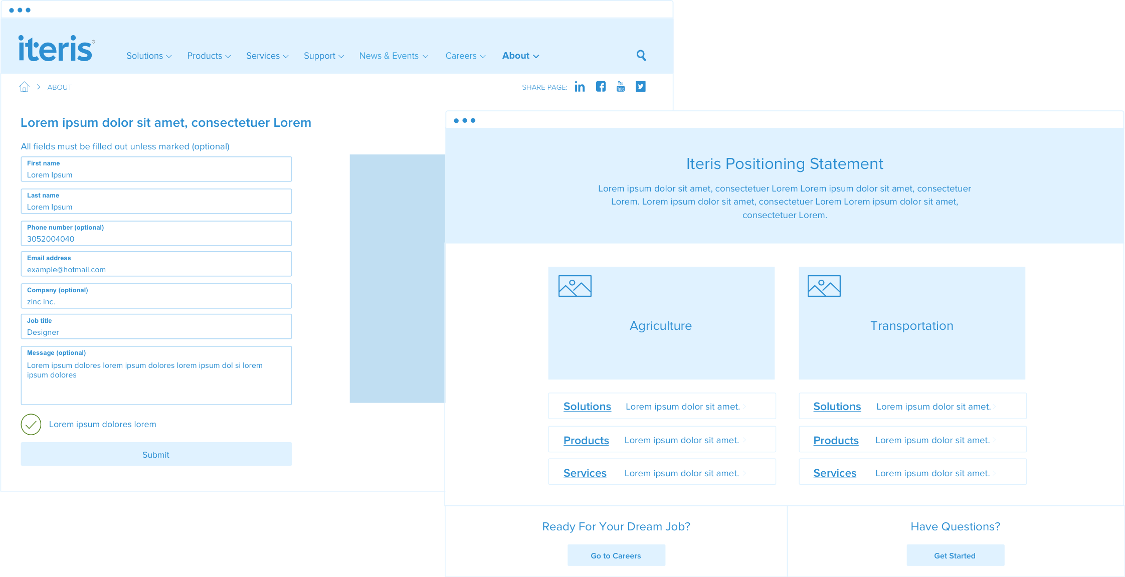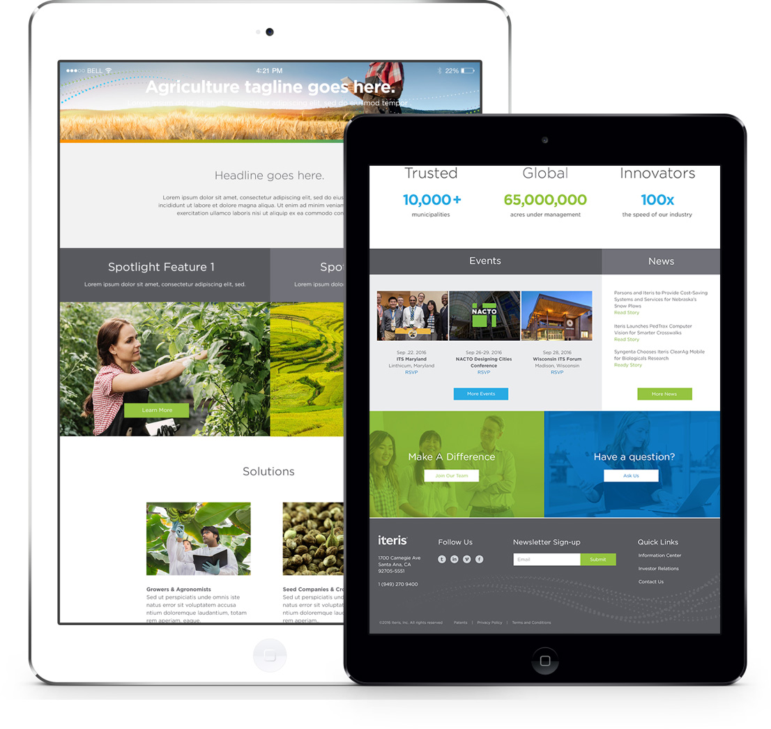 Iteris is a global leader in applied informatics for transportation and agriculture. The company was growing so new products and departments needed to be represented. The project was divided into multiple phases, I led the UX during Phase 1 and was supported by a team of 3, comprised of 2 Visual Designers and a PM. View live site.
